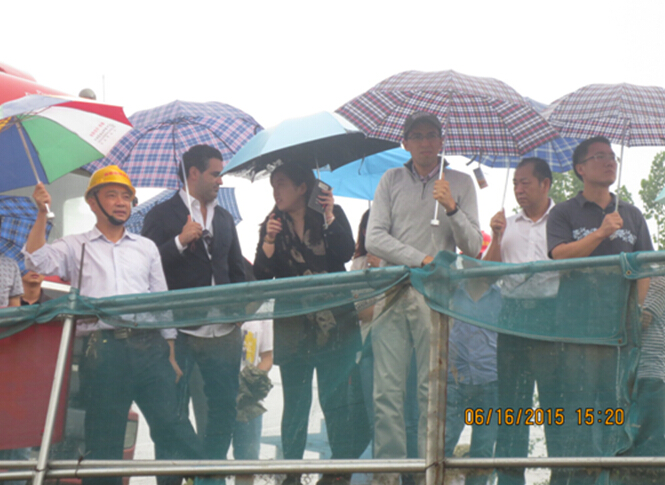 6月16日下午,世界銀行、港投集團、臨泉縣地方政府等一行領(lǐng)導(dǎo)冒著暴雨蒞臨楊橋船閘擴建工程項目檢查工作。