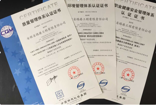 近日,安徽省路港工程有限責(zé)任公司順利通過質(zhì)量、環(huán)境、職業(yè)健康安全管理體系再認(rèn)證。該證書的獲得標(biāo)志著我公司管理體系運(yùn)行有效、適宜、受控,符合現(xiàn)行的質(zhì)量、環(huán)境、職業(yè)健康安全標(biāo)準(zhǔn)要求。