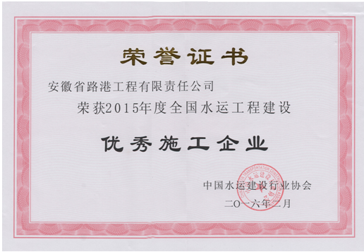 安徽路港榮獲2015年度全國(guó)水運(yùn)工程建設(shè)優(yōu)秀施工企業(yè)稱號(hào)