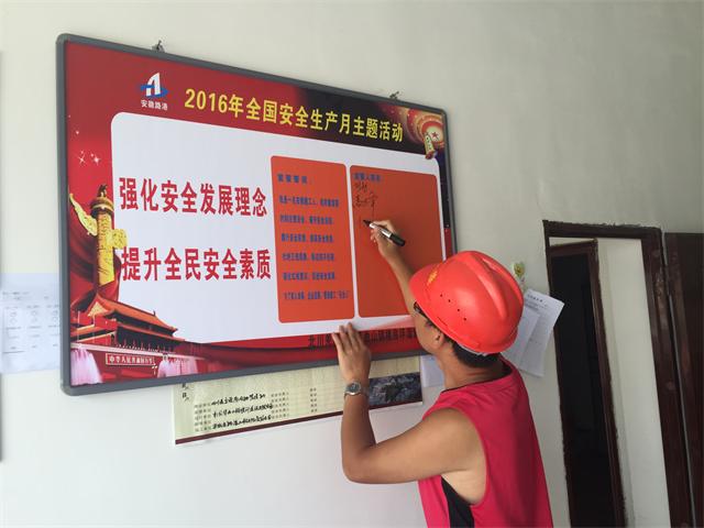 在宣誓儀式上,項(xiàng)目負(fù)責(zé)人做了安全生產(chǎn)總動(dòng)員,他要求全體員工要通過(guò)安全生產(chǎn)月系列活動(dòng)的開(kāi)展,增強(qiáng)安全生產(chǎn)意識(shí),增強(qiáng)責(zé)任感和使命感,強(qiáng)化主體責(zé)任落實(shí),進(jìn)一步抓好事故防范和控制工作,把好現(xiàn)場(chǎng)安全關(guān),時(shí)刻繃緊安全生產(chǎn)這根弦。隨后項(xiàng)目安全部負(fù)責(zé)人帶領(lǐng)全體人員進(jìn)行了宣誓,并在安全月主題宣傳欄上簽下各自的名字。