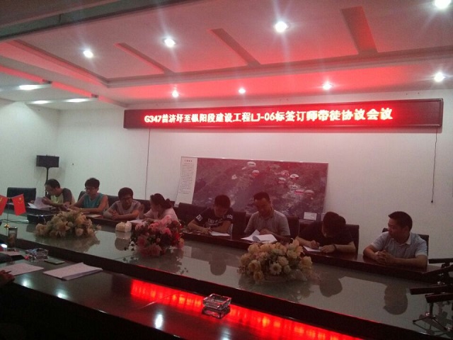 7月25日, G347普濟(jì)圩至樅陽段建設(shè)工程LJ-06標(biāo)項(xiàng)目部在會(huì)議室舉行“師帶徒”協(xié)議簽訂儀式。在項(xiàng)目部全體成員的共同見證下,6對師徒在《師帶徒協(xié)議書》上莊重地簽下了自己的名字,涉及技術(shù)員、試驗(yàn)員、財(cái)務(wù)等多個(gè)崗位。