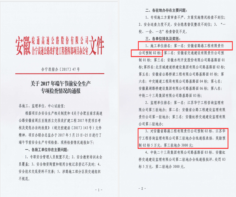 合寧高速改擴(kuò)建項(xiàng)目辦聯(lián)合總監(jiān)辦于2017年5月23日對(duì)全線施工單位和監(jiān)理單位進(jìn)行了端午節(jié)前安全生產(chǎn)專項(xiàng)檢查,安徽路港合寧預(yù)制02標(biāo)在檢查中再次脫穎而出,榮獲第一名,獲得5萬(wàn)元獎(jiǎng)勵(lì)。