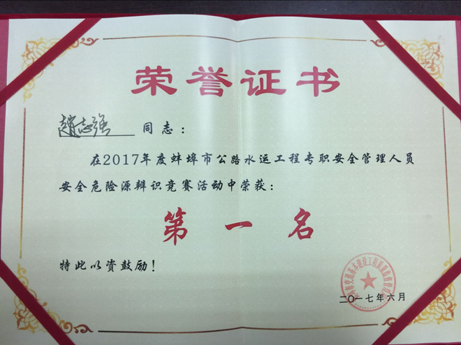 6月29日,在2017年度蚌埠市公路水運(yùn)工程專職安全管理人員安全危險源辨識競賽中,安徽路港五河船閘趙志強(qiáng)同志憑借現(xiàn)場出色表現(xiàn),榮獲第一名。