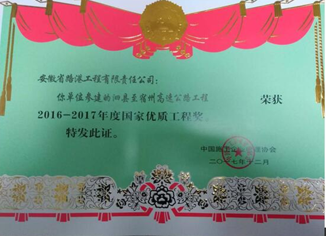 近日,安徽路港公司承建的泗宿高速10標(biāo)在榮獲交通部優(yōu)質(zhì)工程“李春獎”基礎(chǔ)上,再次榮獲2016-2017年度國家優(yōu)質(zhì)工程獎,這也是安徽路港首次獲得該獎項。同時,徐士征同志被授予“國家優(yōu)質(zhì)工程突出貢獻(xiàn)者”榮譽稱號。