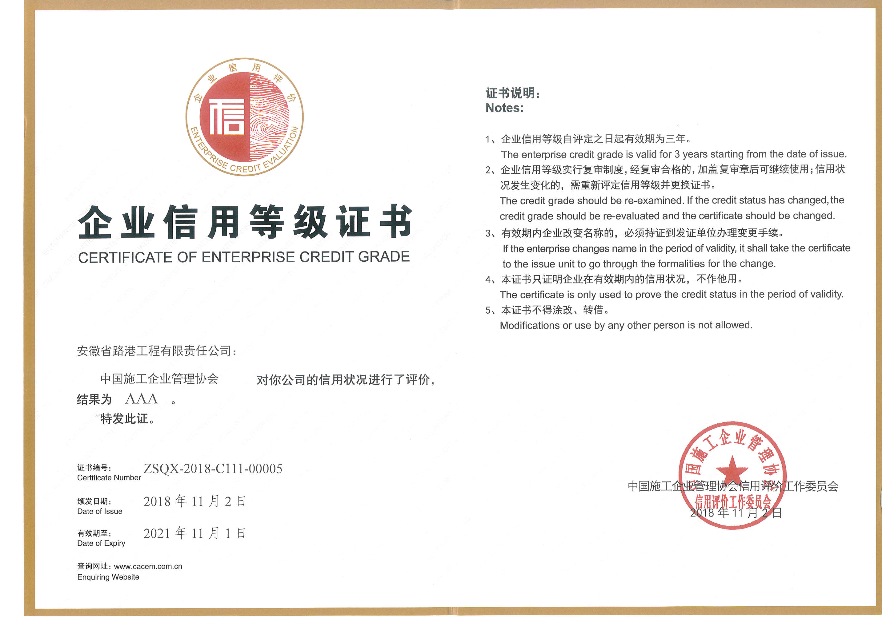 從12月4日在京召開的2018年工程建設(shè)誠信企業(yè)推介大會上傳來喜訊,安徽路港公司被中國施工企業(yè)管理協(xié)會授予“工程建設(shè)企業(yè)社會信用評價AAA級信用企業(yè)”稱號。