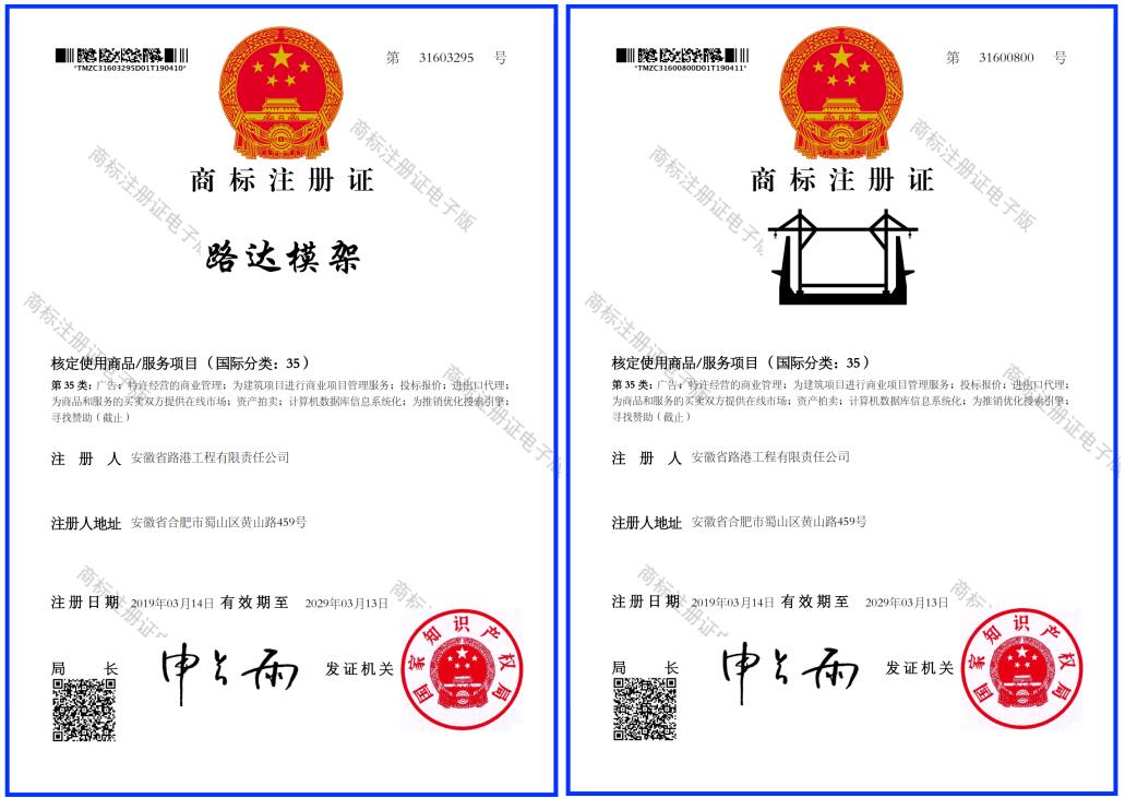 “路達(dá)模架”商標(biāo)注冊(cè)獲得國(guó)家知識(shí)產(chǎn)權(quán)局核準(zhǔn)