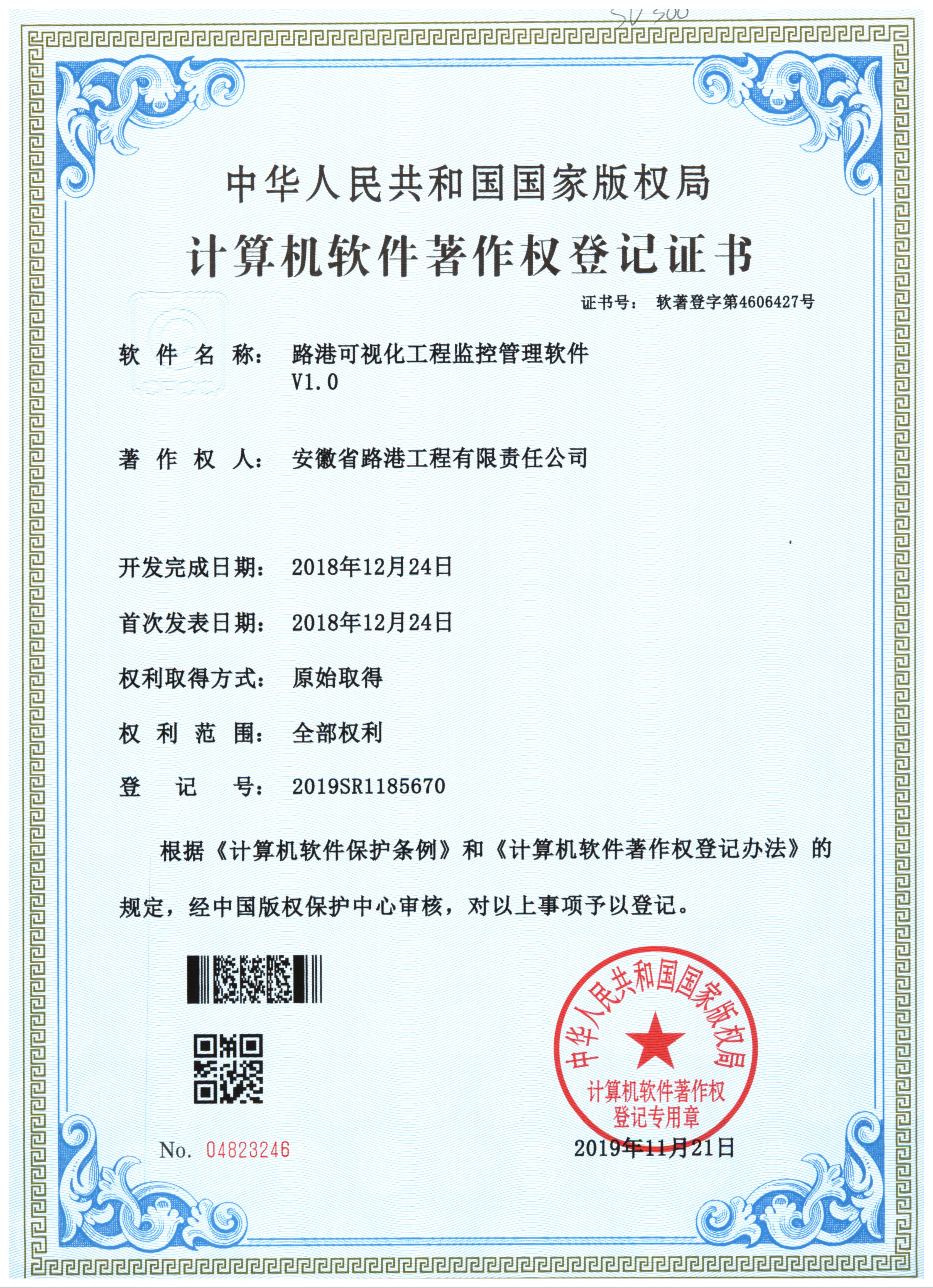 近日,安徽路港公司新取得“路港可視化監(jiān)控軟件V1.0”“路港可視化工程監(jiān)控管理軟件V1.0”兩項(xiàng)計(jì)算機(jī)軟件著作權(quán)。