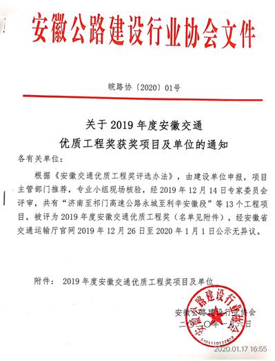 近日,從安徽省公路行業(yè)協(xié)會傳來喜訊,我公司承建的北沿江高速公路滁州至馬鞍山段路基04標(biāo)、路面02標(biāo),北沿江高速公路巢湖至無為段路基04標(biāo),濟(jì)南至祁門高速公路永城至利辛安徽段路基7標(biāo)、路面3標(biāo),G310黃口至河南界段改造工程碭山段01標(biāo),沙穎河航道阜陽市北京路橋至沫河口段整治工程04標(biāo),榮獲2019年度“安徽交通優(yōu)質(zhì)工程”獎。