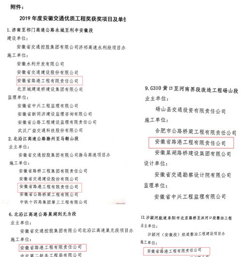 安徽交通優(yōu)質(zhì)工程獎是安徽省公路行業(yè)質(zhì)量獎,此次,全省共 23個項目提交申報資料,其中17個項目接受現(xiàn)場核驗,最終13個項目通過評選。 我公司5個項目獲得該項榮譽(yù),進(jìn)一步鞏固了公司在省內(nèi)交通系統(tǒng)的品牌影響力。
