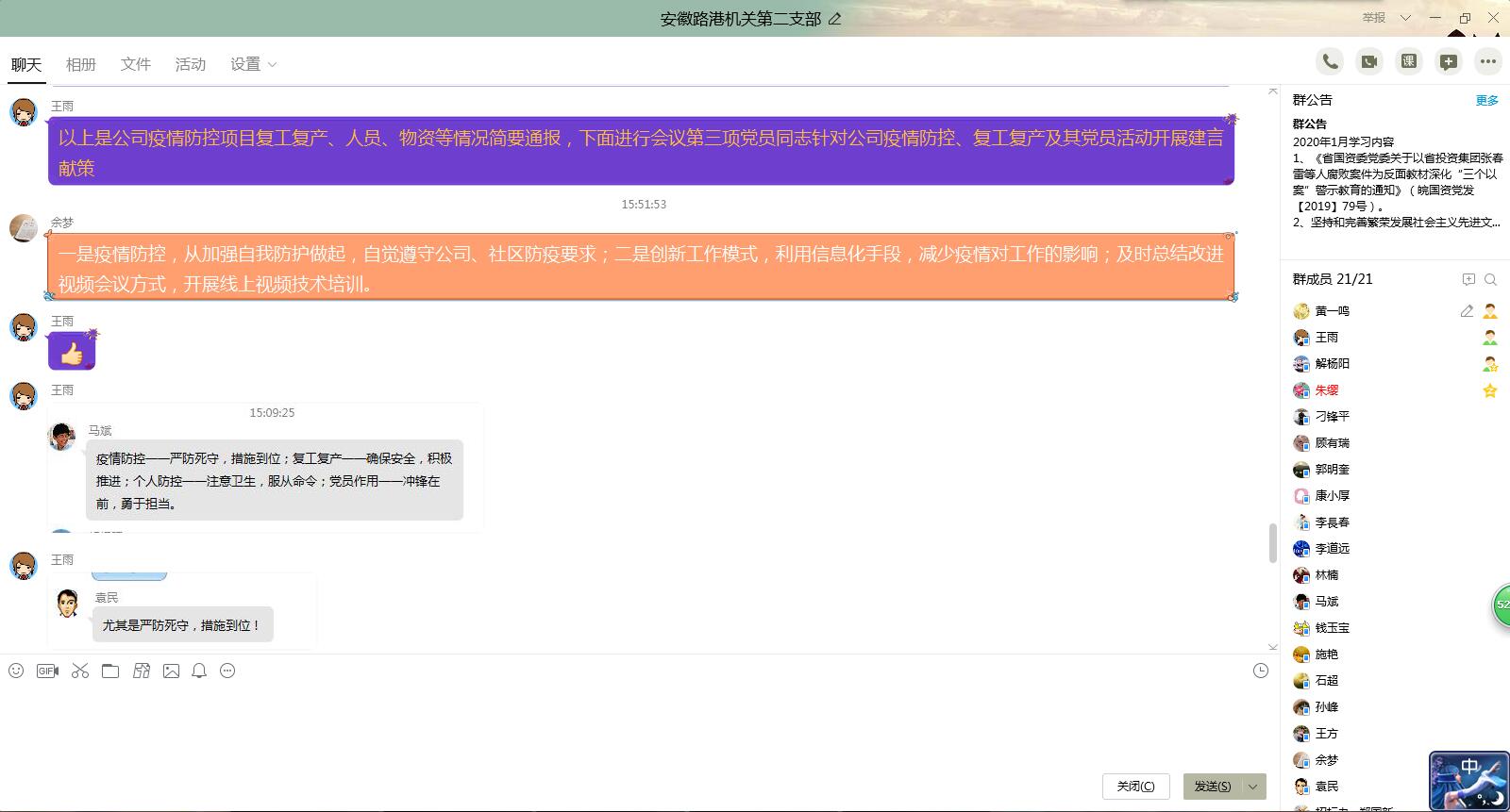 機關(guān)第二黨支部召開黨員大會,為降低染疫風險,本次會議通過QQ群在線交流,支部黨員就公司疫情防控、復(fù)工復(fù)產(chǎn)及黨員活動積極建言獻策。