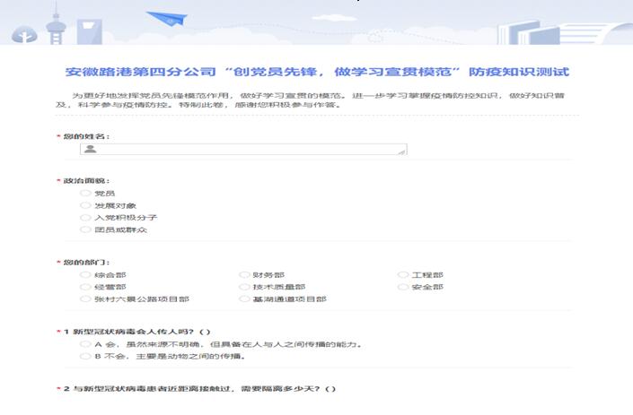 四分公司黨支部聯(lián)合工會,開展“創(chuàng)黨員先鋒,做學(xué)習宣貫?zāi)7丁本€上防疫知識答題活動,促使員工深入掌握防控知識,科學(xué)參與疫情防控。
