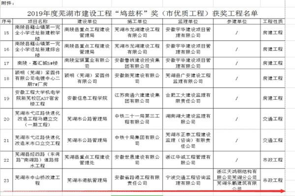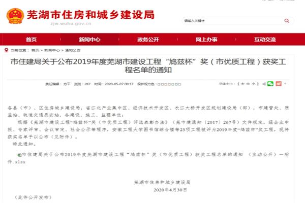 近日,蕪湖市住建局公布了2019年蕪湖市建設(shè)工程“鳩茲杯”獎(市優(yōu)質(zhì)工程)獲獎工程名單。安徽路港承建的蕪湖市中山橋改建工程榜上有名,也是公司首個項目獲此殊榮。