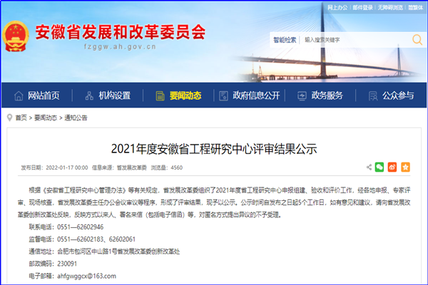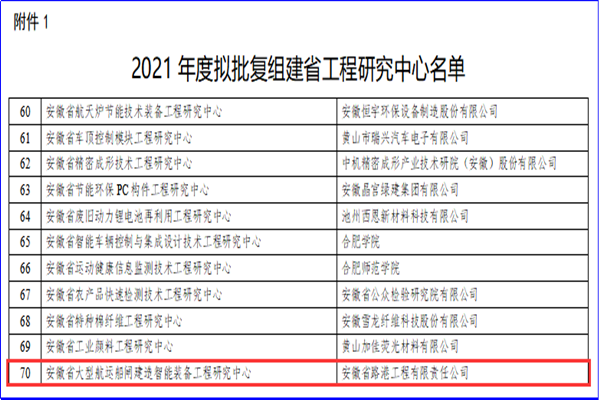 1月17日,安徽省發(fā)展和改革委員會公布了“2021年度安徽省工程研究中心評審結(jié)果公示名單”,安徽路港公司的《安徽省大型航運船閘建造智能裝備工程研究中心》經(jīng)過層層遴選,通過專家評審、現(xiàn)場答辯核查、省發(fā)改委審議后成功入選。
