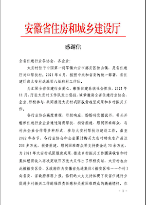 近日,省住房與城鄉(xiāng)建設(shè)廳向公司發(fā)來感謝信,對公司參與太安村幫扶與建設(shè)工作表示感謝。
