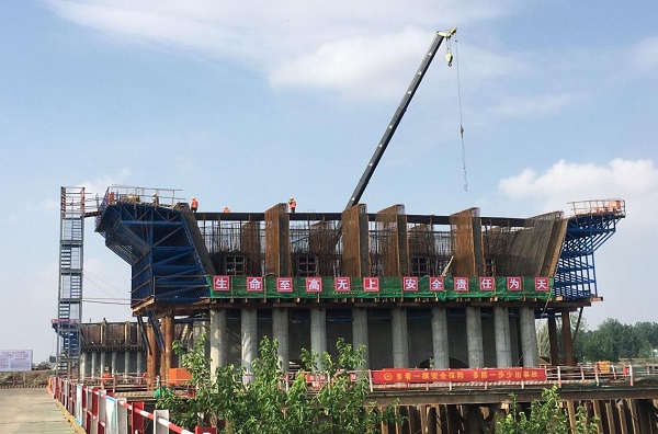 經(jīng)過技術(shù)分析、經(jīng)濟對比,安徽路港公司自主研發(fā)出“復(fù)雜水域大跨度寬幅現(xiàn)澆箱梁大型掛籃的施工方法”、“大懸臂斜腹板寬幅箱梁工程施工”、“柱墩復(fù)合式現(xiàn)澆支架0#塊工程施工臨時固結(jié)工藝”、“墩身模板采用墩身花瓶形式的定型大塊鋼模板拼裝”、“承臺鋼筋綁扎采用一種帶有立柱、梳齒板、鋼筋限位件的鋼筋綁扎定位裝置實現(xiàn)精確綁扎”等一系列施工新技術(shù)。