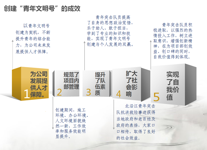 爭創(chuàng)活動中,主要圍繞8個方面開展工作。一是建立以突擊隊隊長為負責人的創(chuàng)建領(lǐng)導(dǎo)小組,定期組織上團課,加強隊員思想教育;二是開展“我為重點工程獻青春”為主題的勞動競賽活動,激發(fā)團員青年的拼搏奉獻精神;三是建立健全創(chuàng)建檔案,做好資料留存;四是以服務(wù)青年為中心,以提高工作質(zhì)量和效率為重點,創(chuàng)新工作模式;五是做好“師帶徒”,抓好“傳、幫、帶”, 設(shè)定青年人才培養(yǎng)目標,促進青年崗位成才;六是成立青年志愿者服務(wù)隊,開展志愿幫扶;七是建立青年安全監(jiān)督崗,助力安全生產(chǎn);八是結(jié)合項目實際,組織開展文體活動。