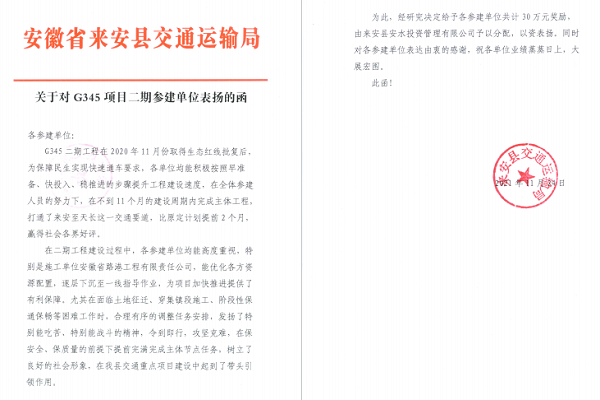 在不到11個月的時間內(nèi),項目部克服了征遷、穿集鎮(zhèn)段施工、階段性保通保暢、工期異常緊張等困難,保質(zhì)保量地完成了主體節(jié)點任務(wù),比原計劃提前2個月打通了來安至天長這一重要交通要道,收到來安縣交通運輸局表揚信,并喜獲30萬元獎勵,贏得社會各界的好評,更樹立了良好的企業(yè)形象。