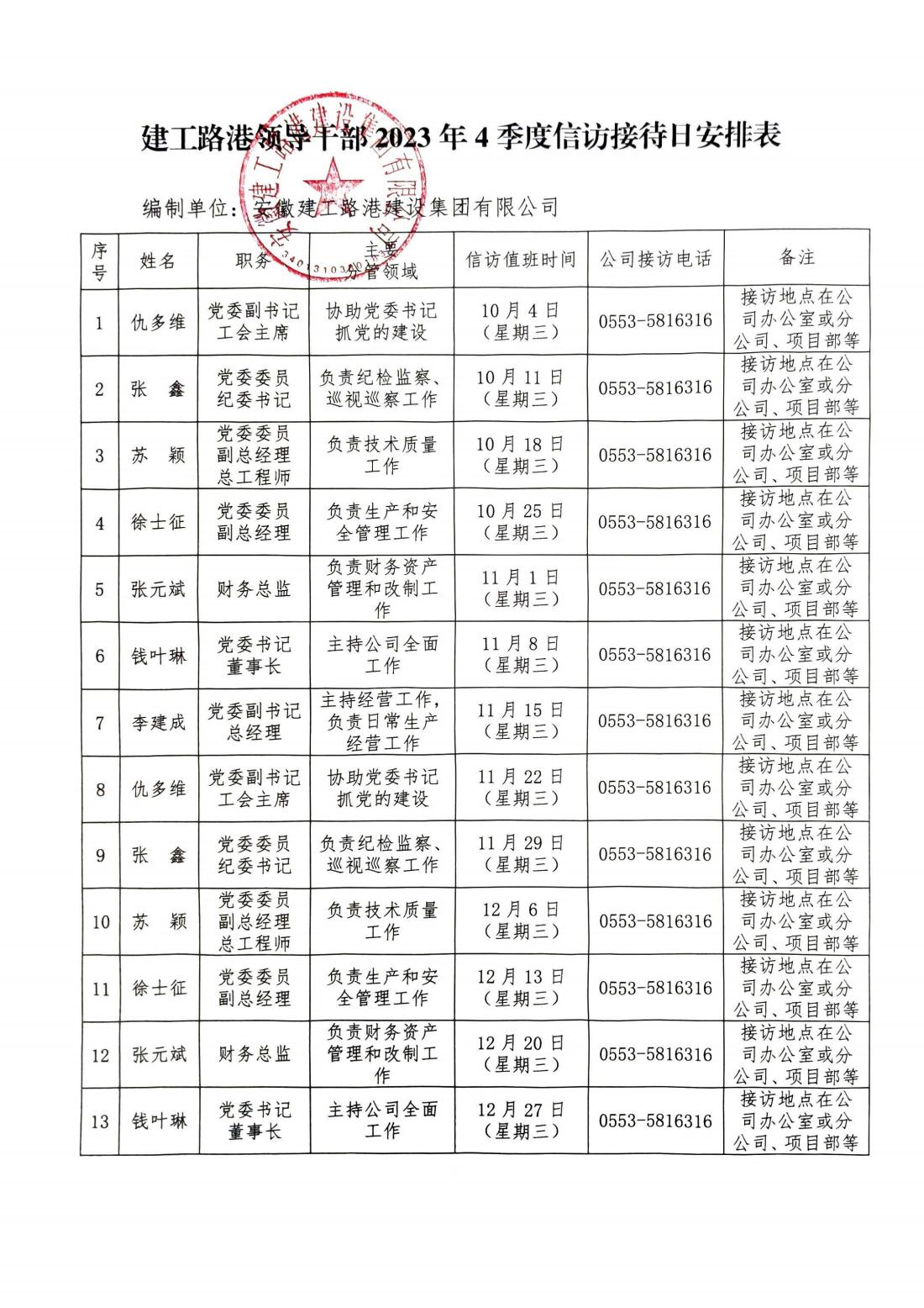 建工路港領(lǐng)導(dǎo)干部2023年4季度信訪接待日安排表