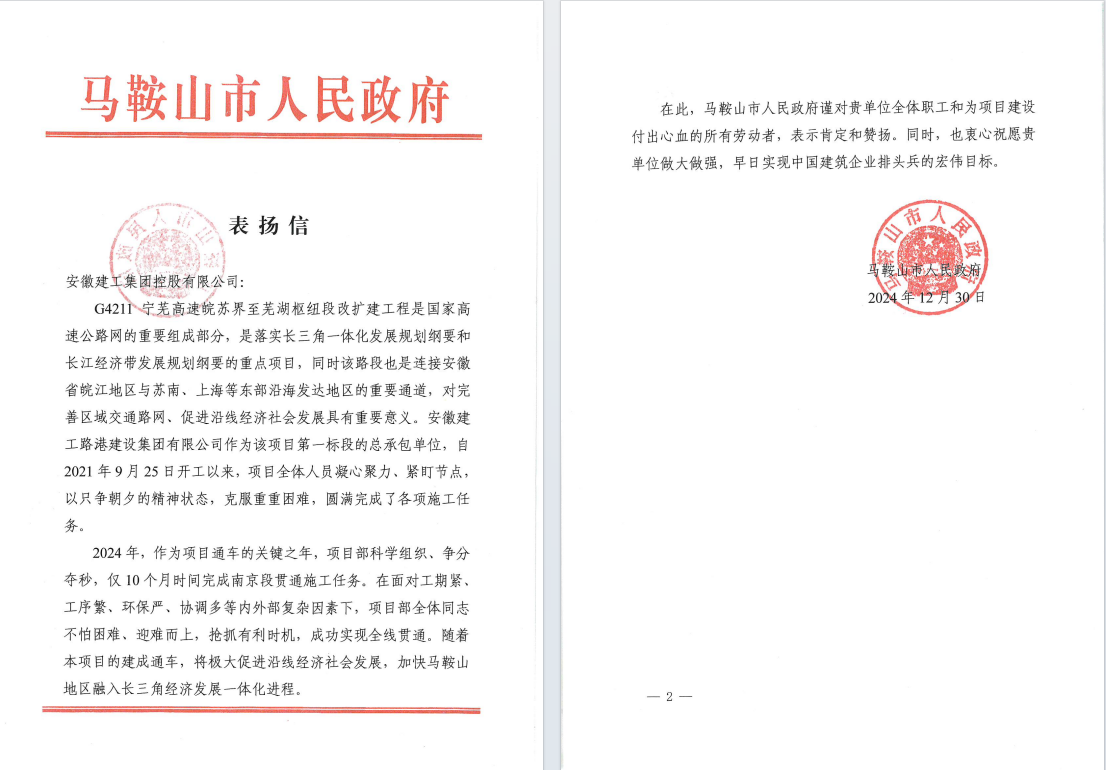 2024年12月30日,項目部收到了來自馬鞍山市人民政府的表揚信,表揚信中對安徽建工集團及安徽建工路港建設集團有限公司全體職工和為項目建設付出心血的所有勞動者表示了肯定和贊揚。這是對項目團隊辛勤付出的最大的肯定,也是對他們專業(yè)精神和敬業(yè)態(tài)度的高度認可。這份表揚信不僅是一份榮譽,更是一種激勵。這份表揚信的背后,是項目團隊無數(shù)個日夜的堅守和付出,為當?shù)亟?jīng)濟社會發(fā)展做出重要貢獻,也為集團、公司在今后的項目建設中積累了寶貴的經(jīng)驗,樹立了良好的品牌形象。