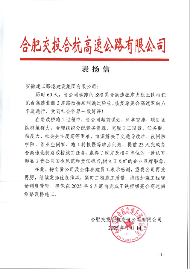近日,建工路港S90蕪合高速肥東支線路基項目收到合肥交投合杭高速公路有限公司的表揚信。