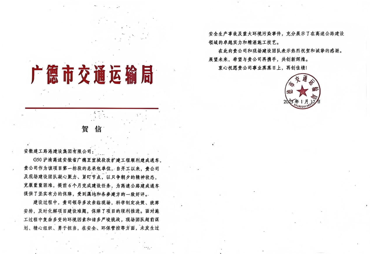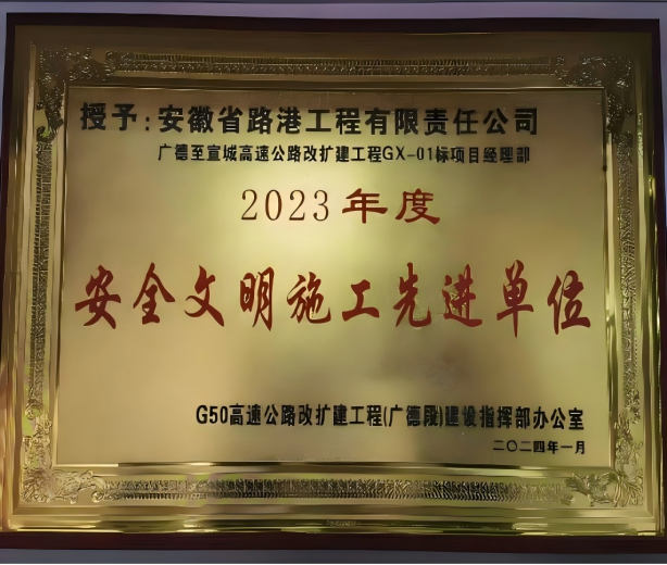 在項目建設(shè)的征程中,項目部一路奮楫篤行,斬獲多項殊榮,在多個領(lǐng)域取得了顯著成績。項目部多次獲得省質(zhì)安中心和業(yè)主、監(jiān)理單位的認(rèn)可表彰,獲業(yè)主單位“2023年度安全文明施工先進(jìn)單位”及環(huán)協(xié)“AAA級環(huán)保示范工地”稱號,收到廣德市交通運輸局賀信,受到屬地及各參建單位的一致好評,并多次在公司項目“流動紅黃旗”綜合評比中名列前茅。同時,項目黨支部榮獲集團(tuán)2024年下半年“流動紅旗”黨組織稱號,項目9人獲得公司及業(yè)主單位榮譽,這些成績見證了項目部全體人員的辛勤付出和突出表現(xiàn)。