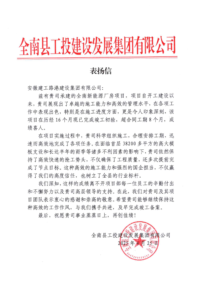 近日,建工路港收到江西省全南縣工投建設(shè)發(fā)展集團(tuán)有限公司發(fā)來的表揚(yáng)信,信中對公司在全南縣新能源產(chǎn)業(yè)園標(biāo)準(zhǔn)廠房及配套基礎(chǔ)建設(shè)項目中的出色表現(xiàn)予以高度肯定。