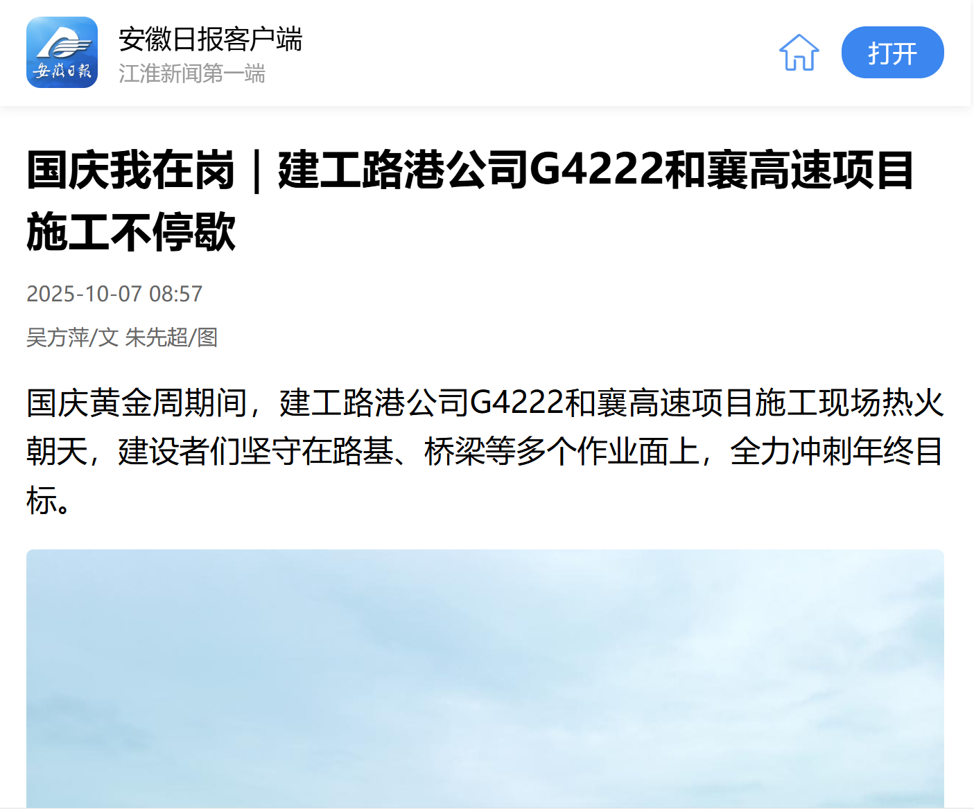 中秋國慶“雙節(jié)”期間,安徽日報對建工路港公司承建的G4222和襄高速項目、滁合高速支線項目等重點項目“雙節(jié)”攻堅大干進行了報道。