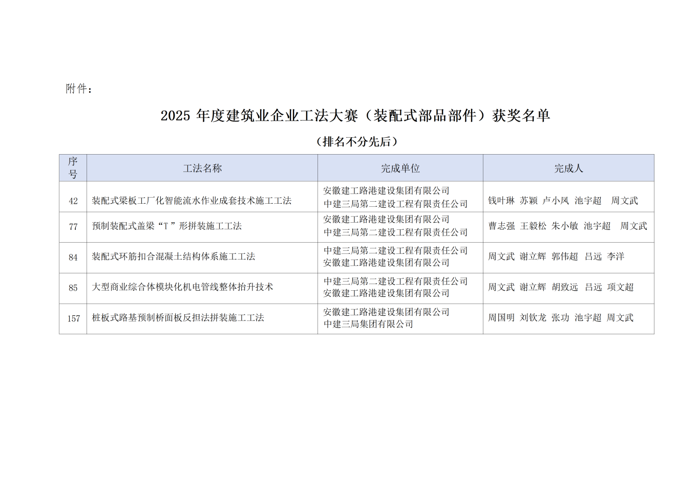近日,中國建筑業(yè)協(xié)會公布了2025年度建筑業(yè)企業(yè)工法大賽(裝配式部品部件)評選結(jié)果,建工路港申報的“裝配式梁板工廠化智能流水作業(yè)成套技術施工工法”等5項工法獲獎。